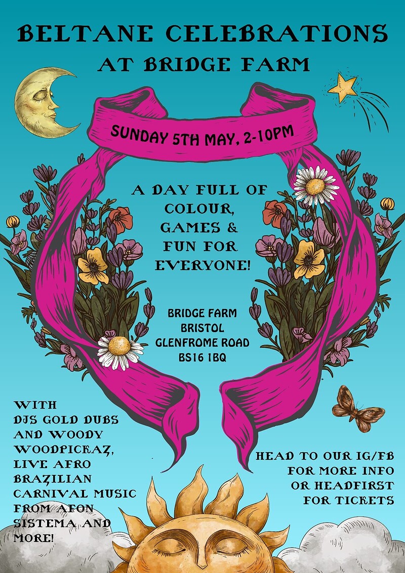 To begin with, you might want to head down to the Springfield Allotments on Sunday for Wander Gather – a Beltane celebration with live music, folktales, a short film, open mic – and the burning of a real wickerman! For something even grander in scale, check out Bridge Farm’s Beltane celebration (also on Sunday): an all-day affair with workshops, activities, fire ceremony, DJ, carnival drummers and more!